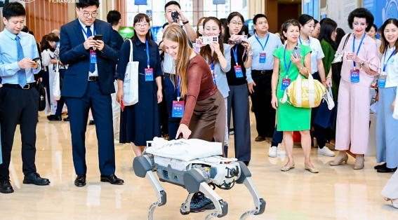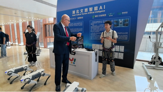 展會現場,國際旅游聯合會主席埃里克·杜呂克特地來到鄂旅股份展區,對智能設備終端表現出極大的興趣。杜呂克與機器狗互動并和工作人員進行親切交流,對此次參展的智能設備給予了高度評價。