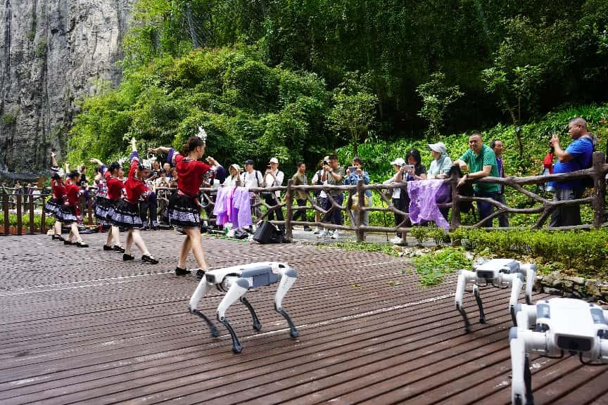 在景區迎客松處,旅行商熱情打卡,合影留念,清江升白云的奇景讓大家宛如登臨仙境一般。在一炷香前,旅行商連連驚嘆,感嘆大自然的鬼斧神工。熱情洋溢的土家族擺手舞與悠揚民歌交織,讓嘉賓們沉浸其中,流連忘返。在景區大地山川,機器狗跳起舞蹈,外骨骼整裝待發,無人機帶飛的VR視野將峽谷全貌盡收眼底,讓大家以“上帝視角”飽覽大峽谷的雄奇壯美。